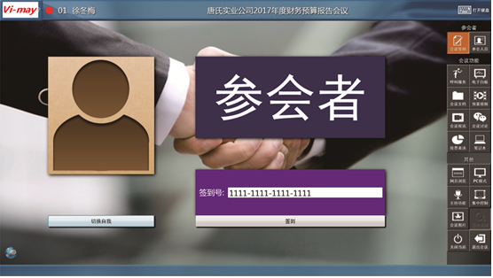 8.签到及电子桌牌功能: 使用签到号进行会议签到,签到号可根据不同会议进行更改,后台实时显示签到结果;本系统集成电子铭牌功能.支持双面升降显示终端